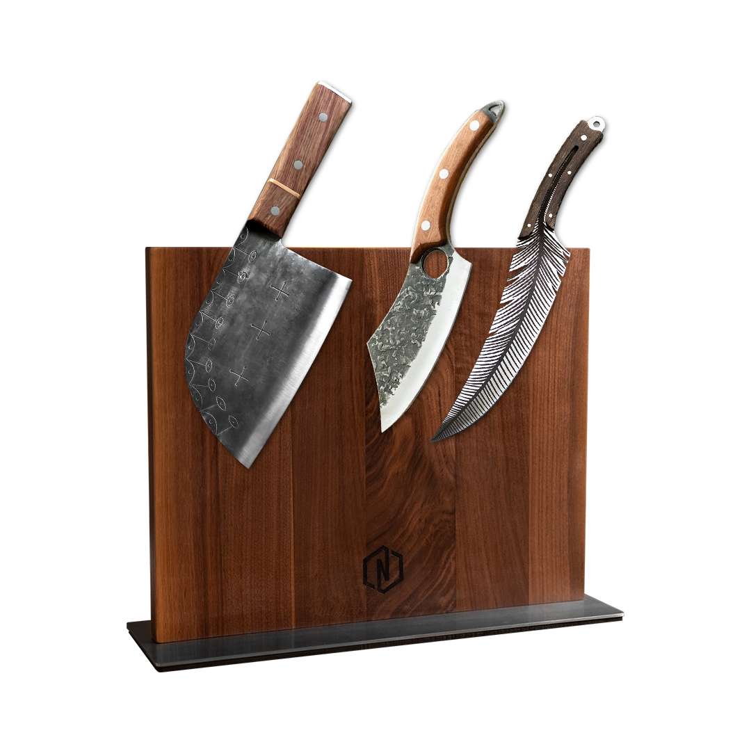 A bold magnetic stand that displays your knives with strength, style, and honor